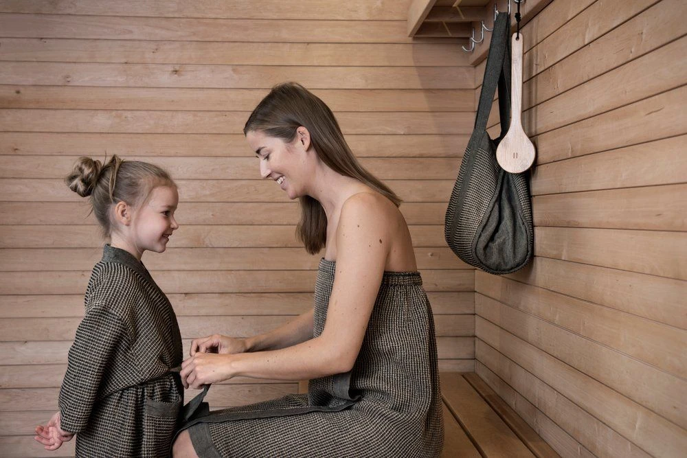 Comfortabele badjas met chambray randen en ceintuur. Kenno saunatextiel is gemaakt van gerecycled katoen, waardoor de stof een natuurlijke zachtheid en levendige textuur heeft. Zacht wassen op 40 graden.