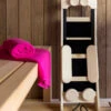 Het strakke en Scandinavische design van het relaxte Pisara saunagereedschap is het resultaat van puur Fins werk. De druppels zijn volledig gemaakt van een huishoudelijk biocomposiet, UPM Form *. Het duurzame en aangenaam aanvoelende natuurlijke vezelcomposiet is een uitstekend materiaal voor de warmte en vochtigheid van een sauna.