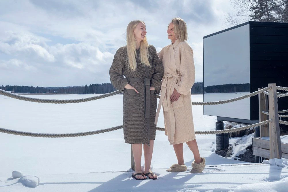 Comfortabele badjas met chambray randen en ceintuur. Kenno saunatextiel is gemaakt van gerecycled katoen, waardoor de stof een natuurlijke zachtheid en levendige textuur heeft. Materiaal 75% gerecycled katoen, 25% polyester. Zacht wassen op 40 graden.