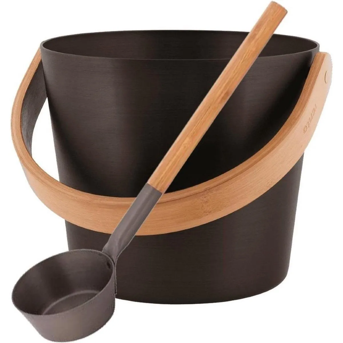 Design sauna emmer met beugel en bijbehorende luxe sauna lepel. De stijlvolle sauna emmer en sauna lepel zijn vervaardigd van geanodiseerd aluminium en warmte-behandeld bamboe hout. Onderdelen zijn ook apart verkrijgbaar: