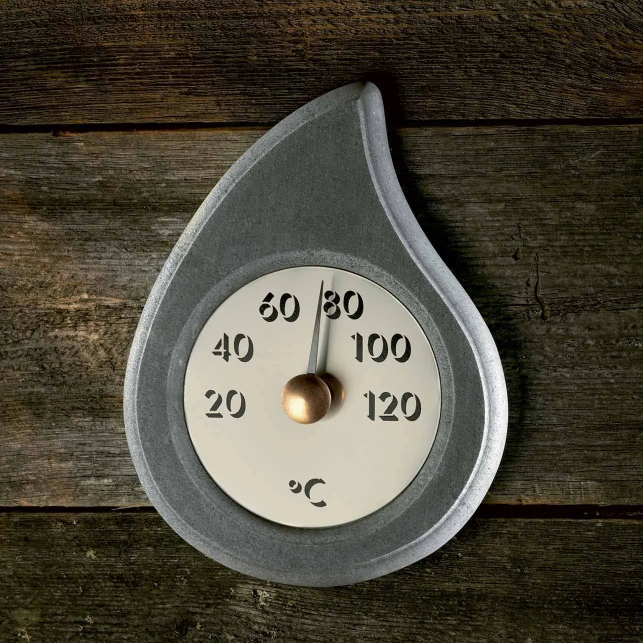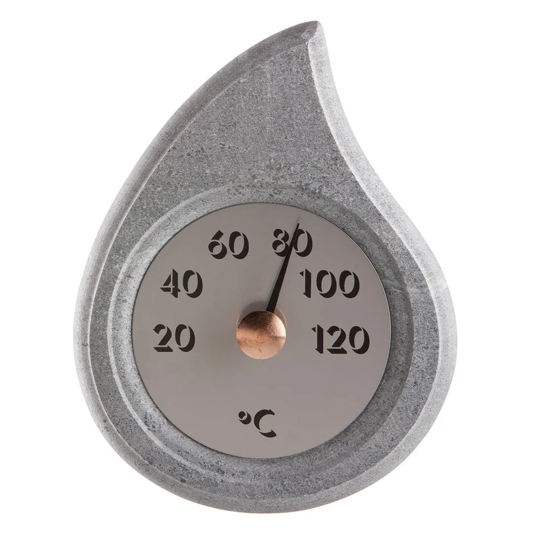 Druppelvormige spekstenen sauna thermometer, waarin oeroud speksteen en glanzend staal stijlvol samenkomen.