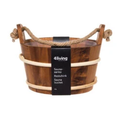 Traditionele houten sauna-emmer met touwgreep en plastic voering. Inhoud 4 liter.