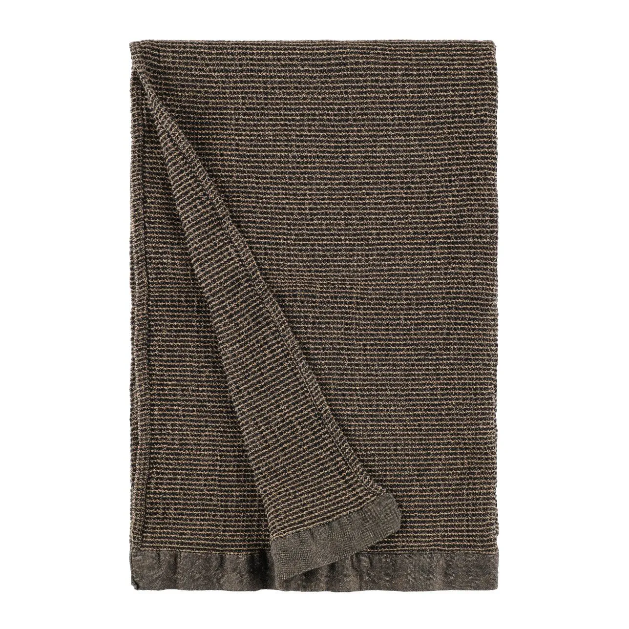 Comfortabele oversized sauna handdoek met chambray randen. Kenno saunatextiel is gemaakt van gerecycled katoen, waardoor de stof een natuurlijke zachtheid en levendige textuur heeft.