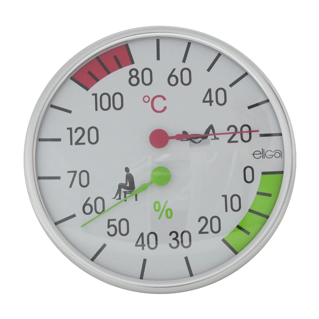 Mooi gedetailleerde sauna hygrometer en sauna thermometer gecombineerd in 1 apparaat. Lees duidelijk de temperatuur en de luchtvochtigheid af van deze gecombineerde sauna hygrometer en sauna thermometer. 128 mm rond, in een speciaal hittebestendig behuizing met een glazen front omring door een mooie chrome metalen ring. Deze hygro- en thermometer werkt op basis van een bimetaal regeling. De waarde van de sauna hygro en thermometer is aan de achterzijde van de meter, handmatig te kalibreren.
