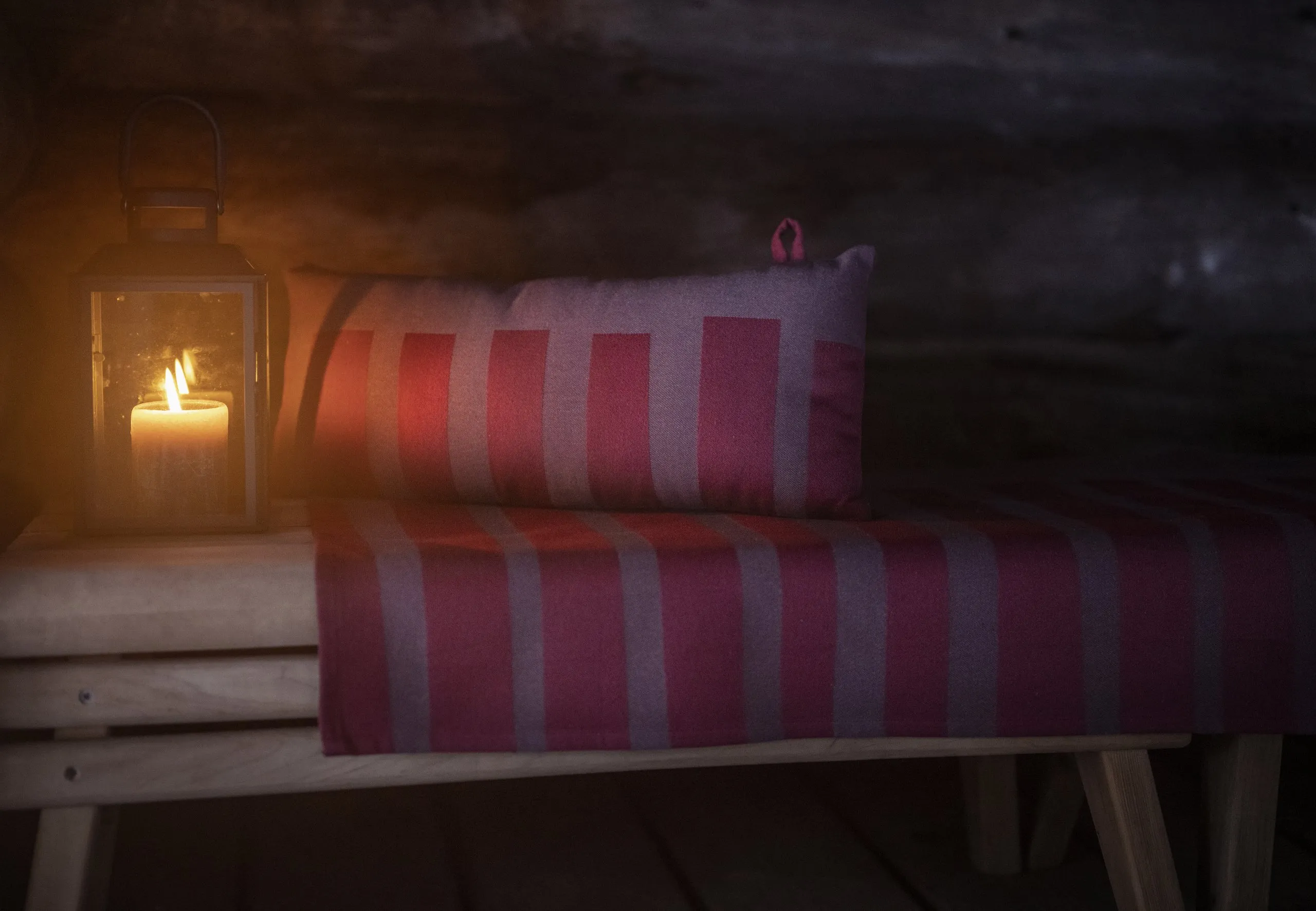 Spoel het kussen na saunagebruik lichtjes af onder de douche of in de wasmachine. Laat het kussen niet te dicht bij een hete saunakachel liggen. Voor gebruik wassen. Apart wassen. Krimp 5 %. Rek in vorm als het nat is na het wassen. Zacht programma 40 °C. Strijken op middelhoog vuur. Niet in de droogtrommel. Niet chemisch reinigen.